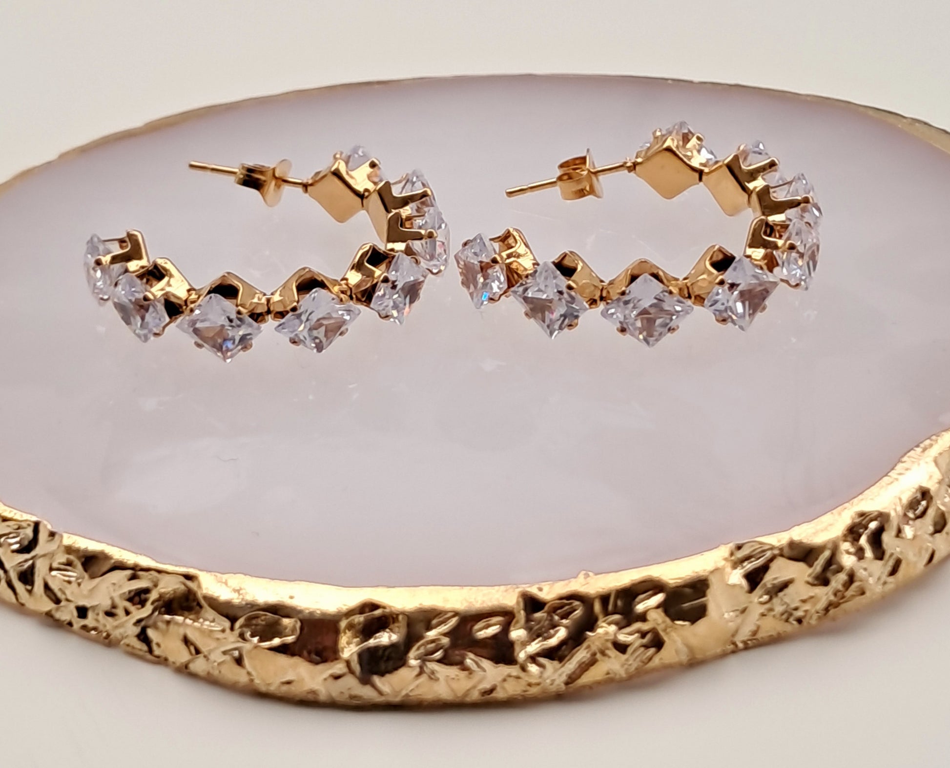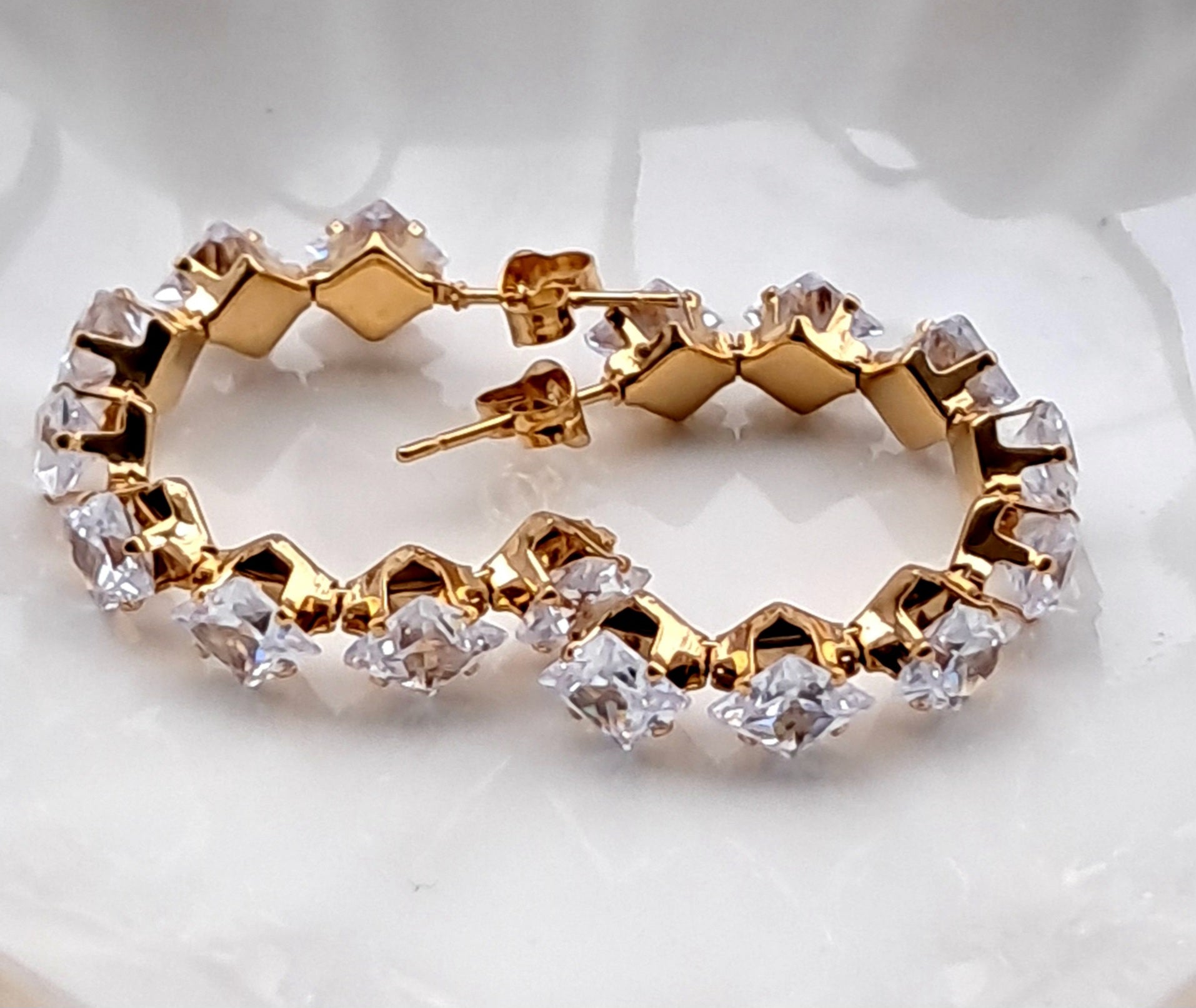 Deslumbre-se com as Argolas Luzia, feitas em aço inoxidável durável e adornadas com zircónias que acrescentam um toque de brilho sofisticado. Com um diâmetro de 30 mm, estas argolas são perfeitas para elevar o estilo do dia a dia, mantendo-se elegantes e intemporais. Ideal para quem aprecia o detalhe e a qualidade de um design clássico em dourado.