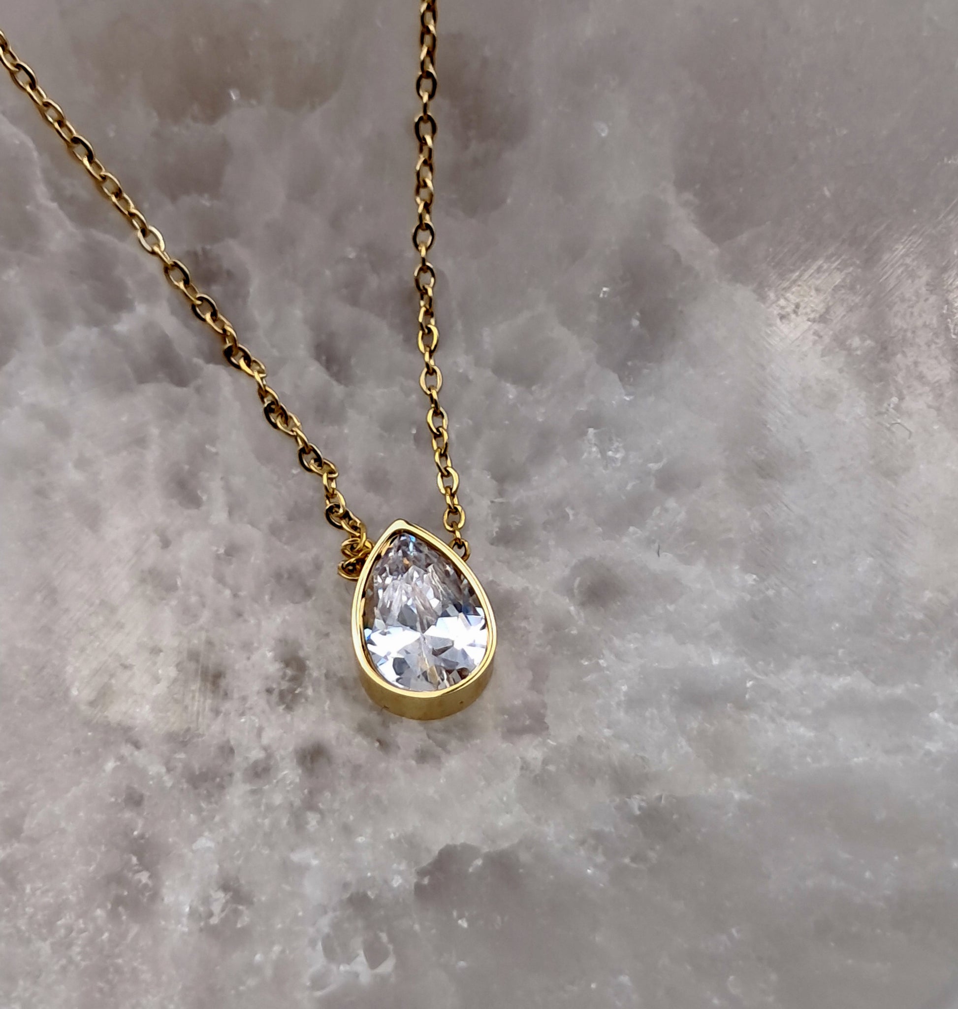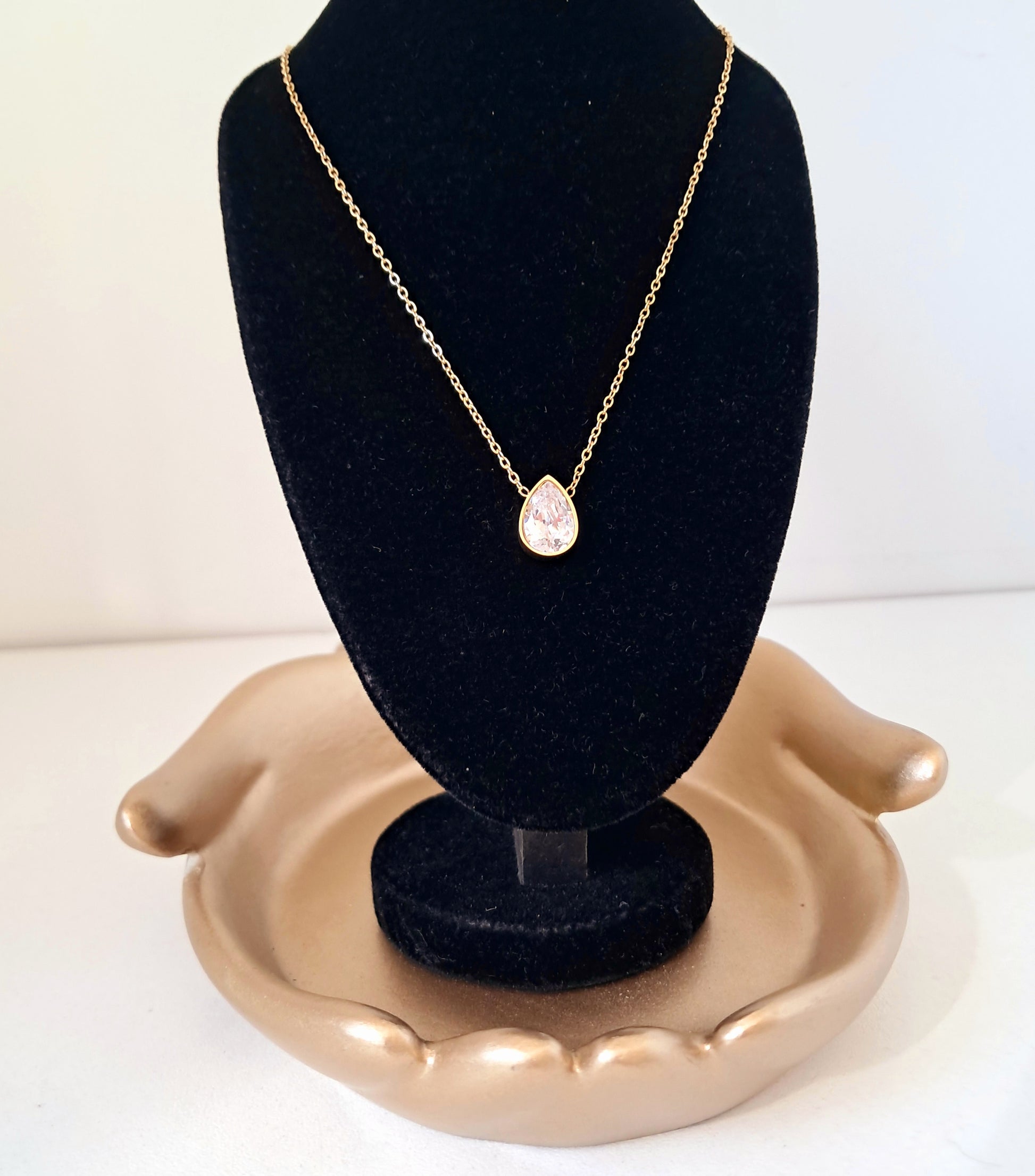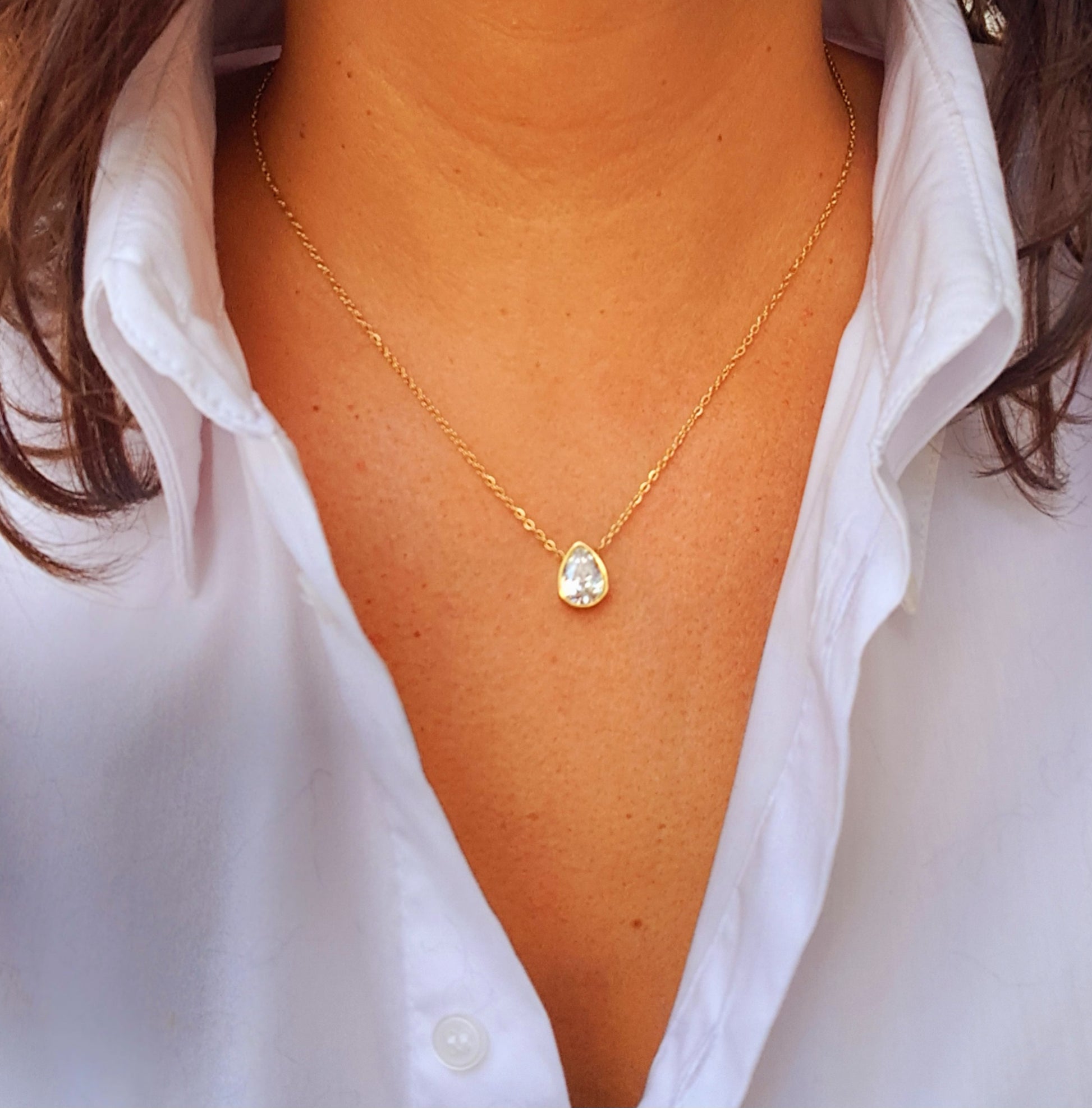 Delicado colar em aço inoxidável com toque de zircónia, com um comprimento de 45 cm + 5 cm de extensão. Apresenta fecho mosquetão e cor dourada. Um acessório sofisticado e versátil.