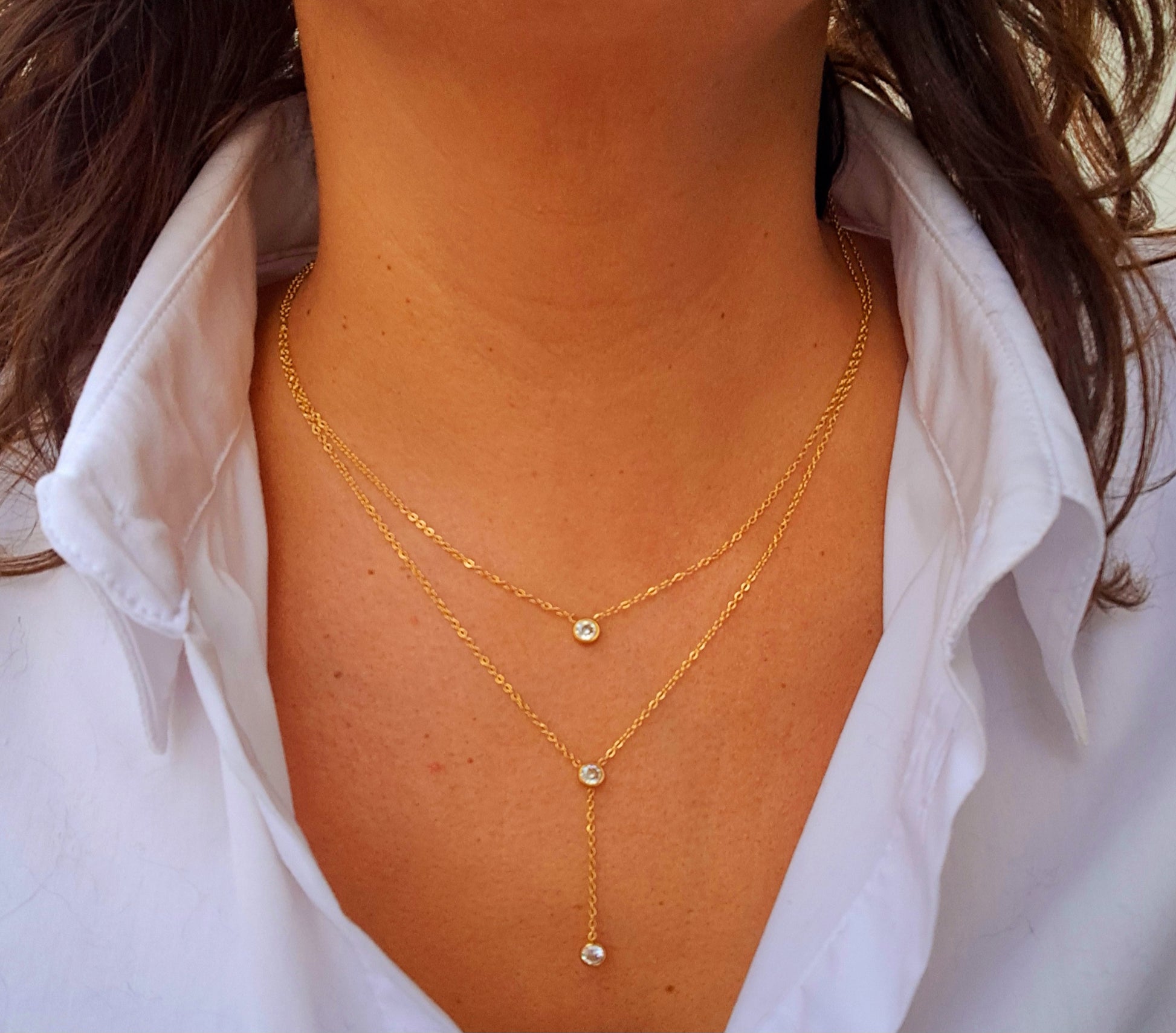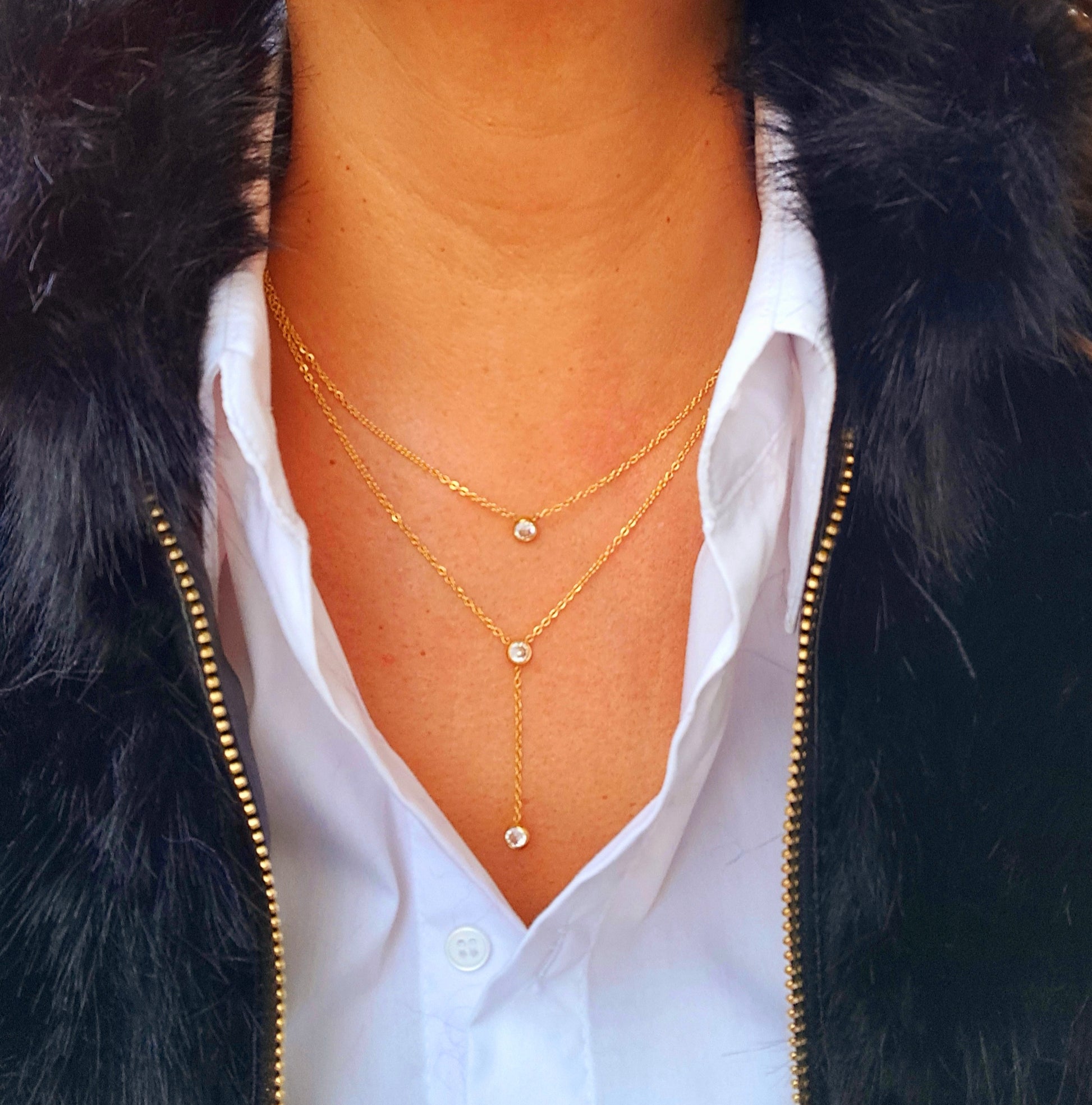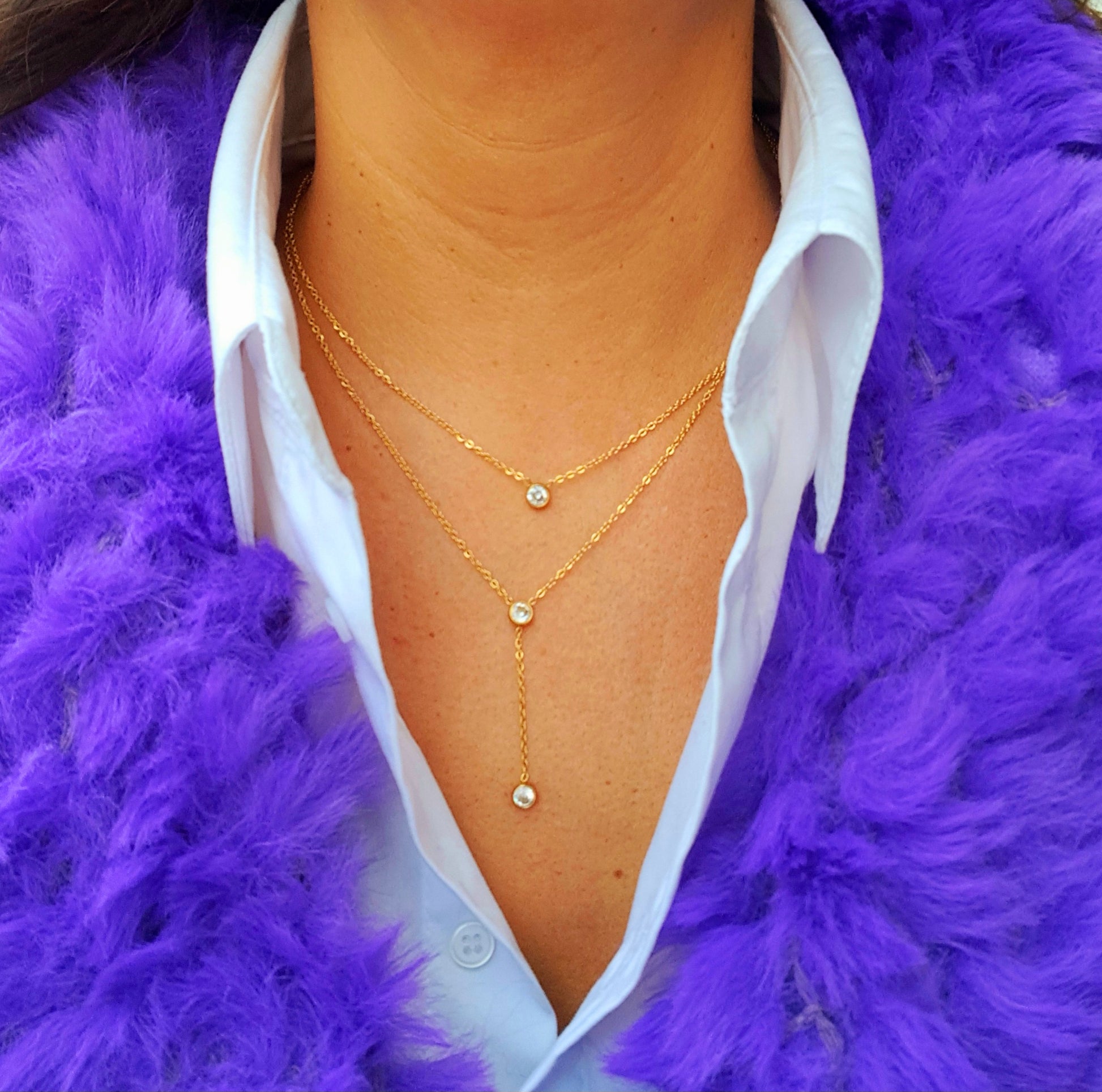 Duplo e com zircónia, este colar de aço inox dourado de 45 cm (com extensão de 5 cm) é moderno e cheio de estilo.