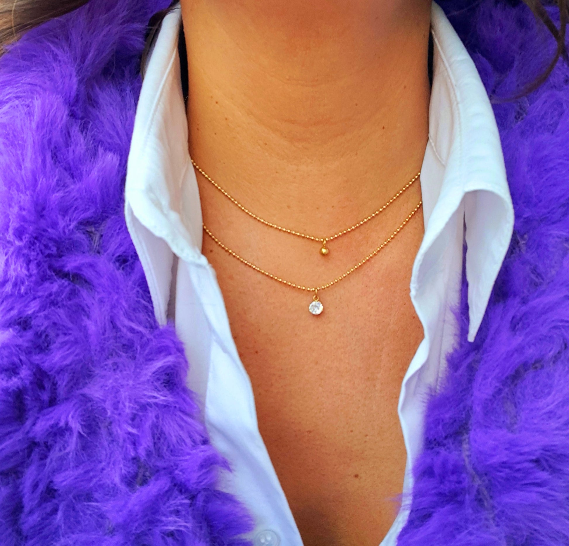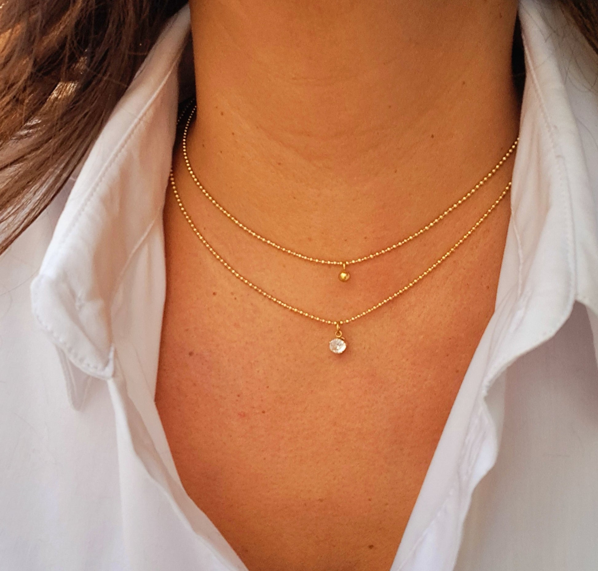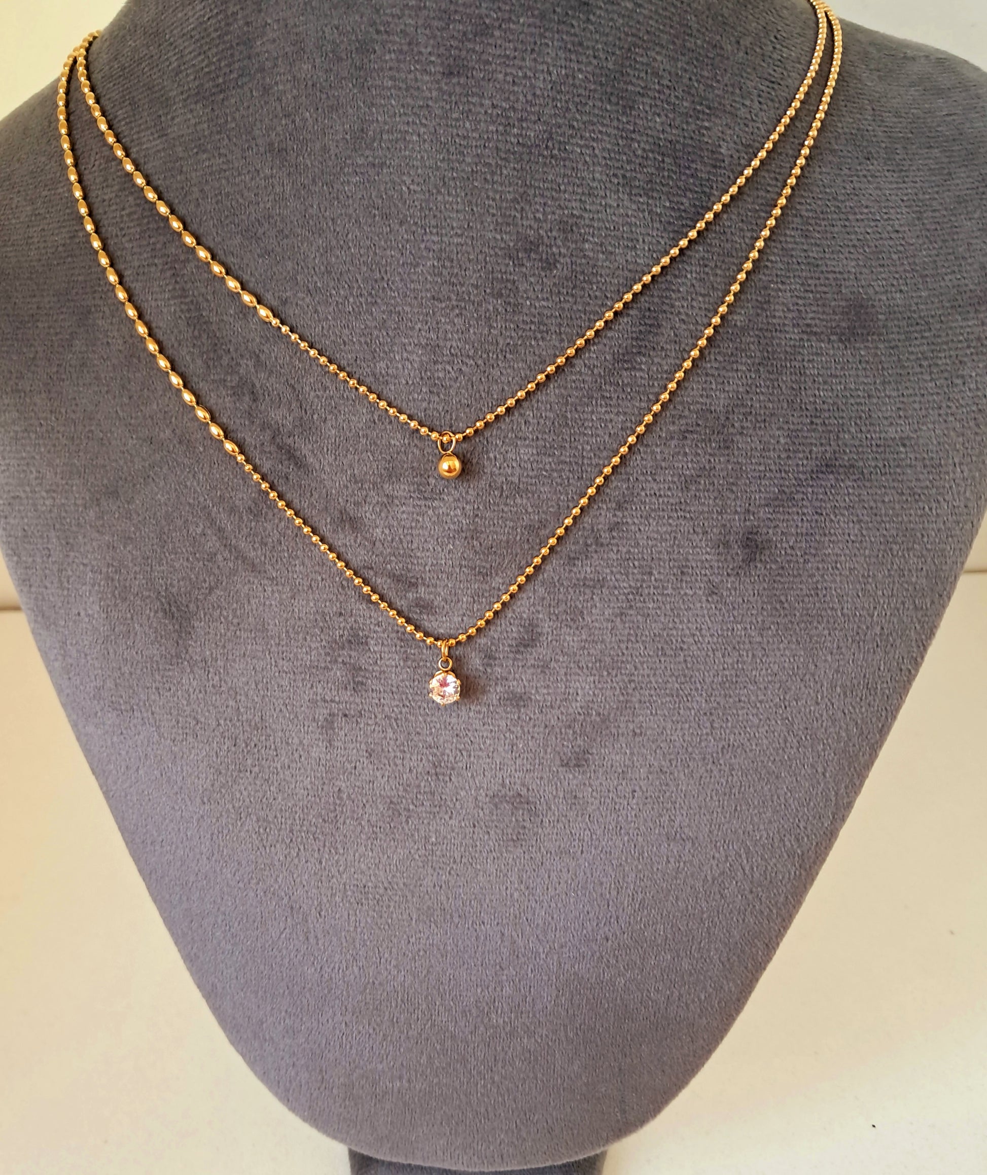 Com zircónia e um comprimento ajustável de 45 cm, este colar duplo em aço inox dourado é ideal para um toque sofisticado.