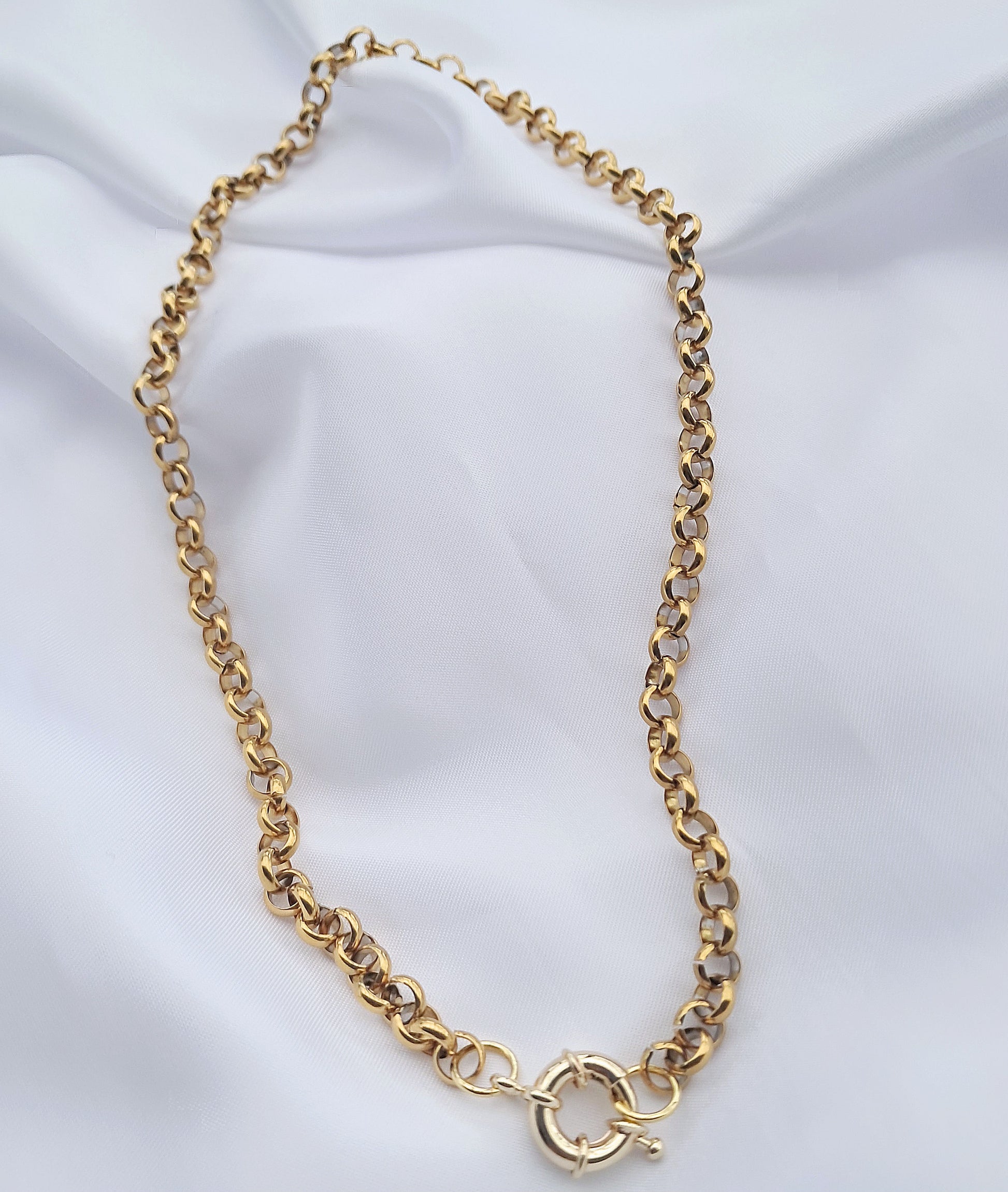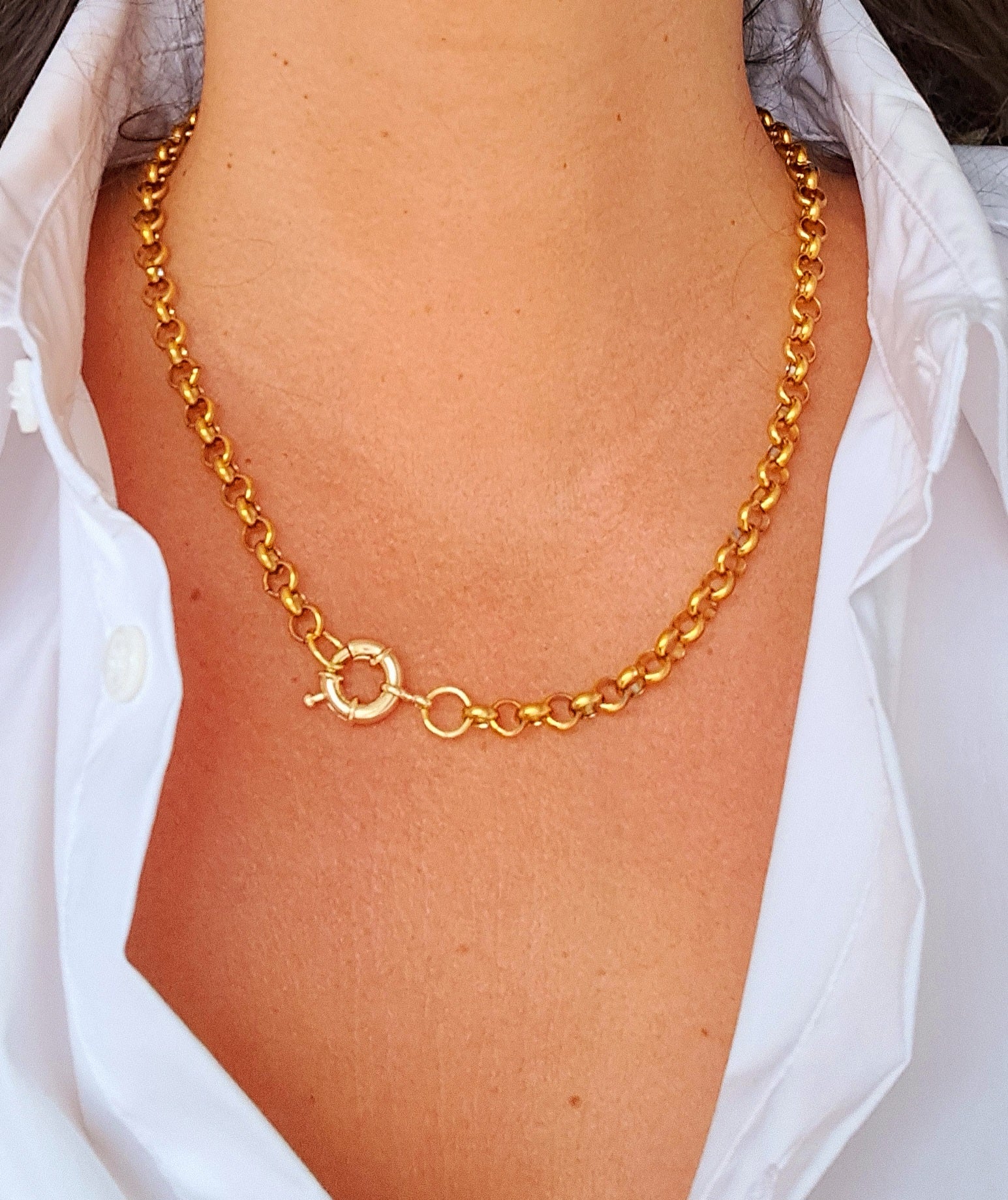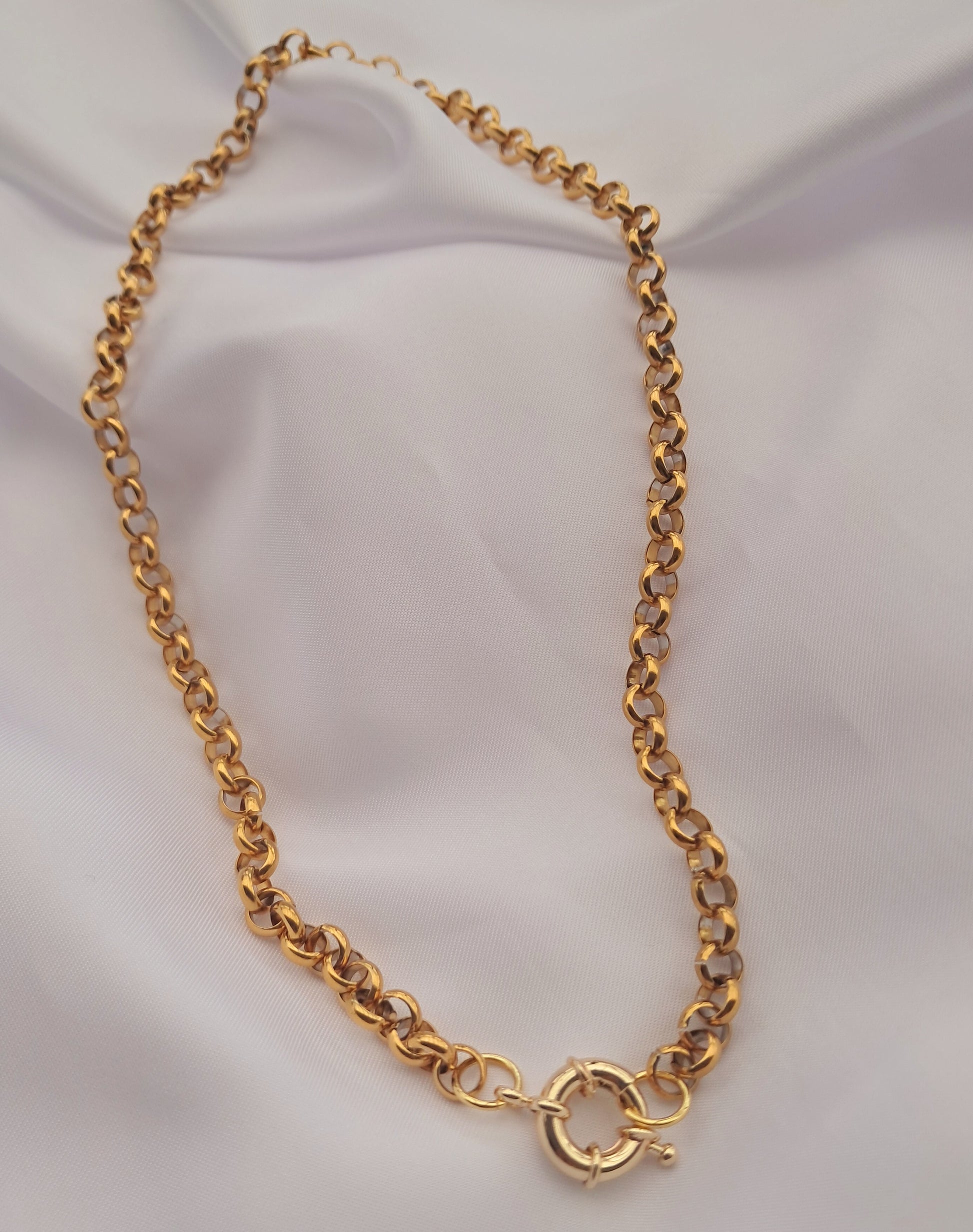O colar Núria é a definição de elegância ousada. Feito em aço inoxidável, em que o mosquetão se destaca pela sua imponência.