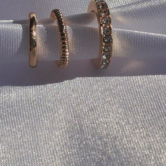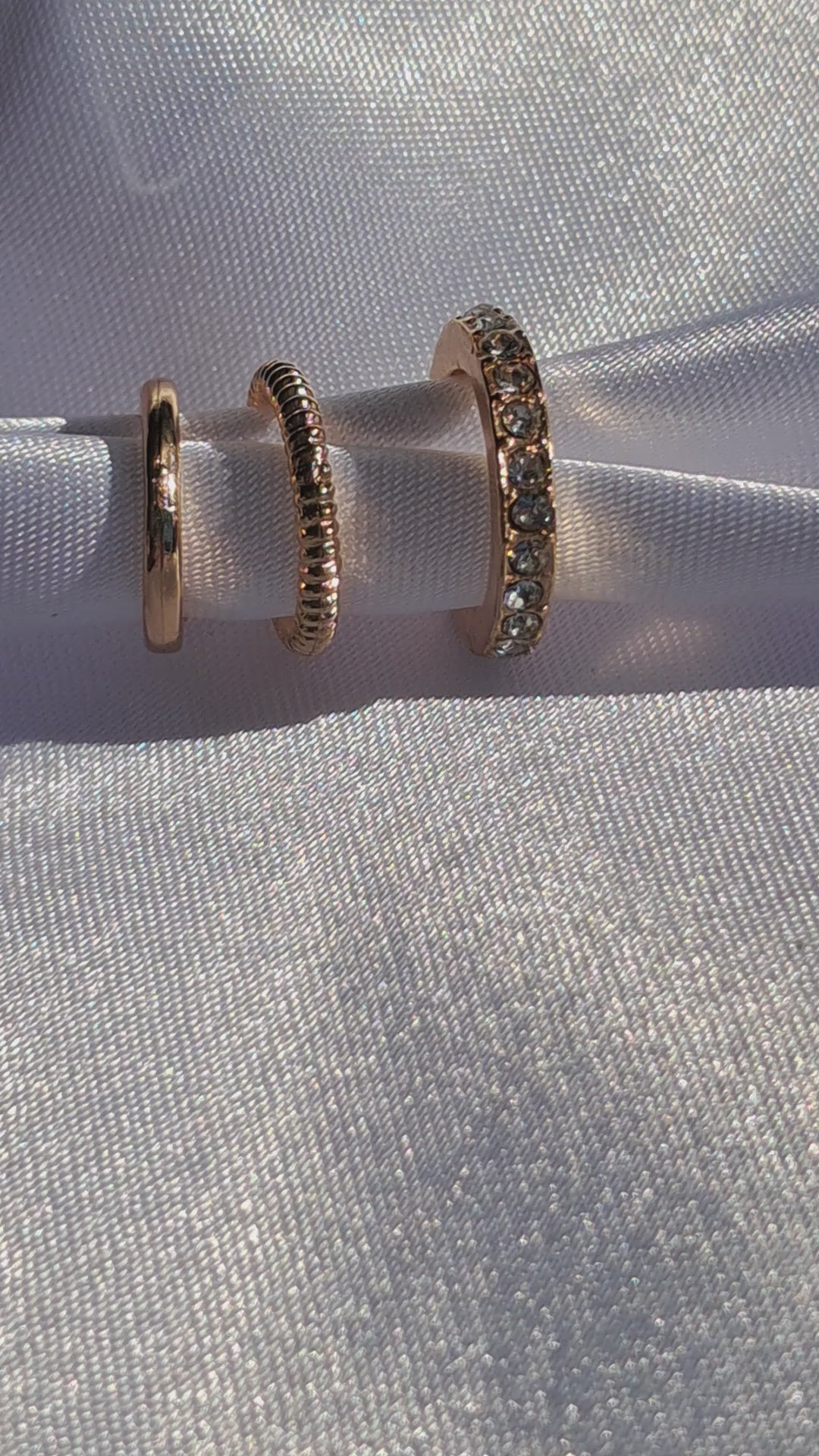 Em aço inoxidável e strass. Não precisas de ter furos nas orelhas para usares o conjunto. Basta apertares cada peça na orelha.