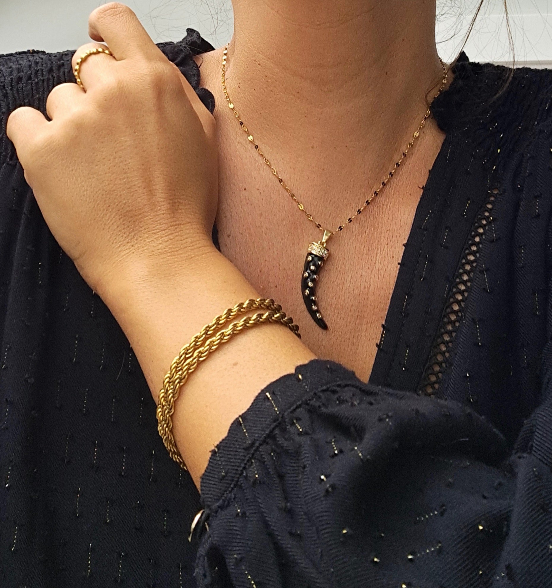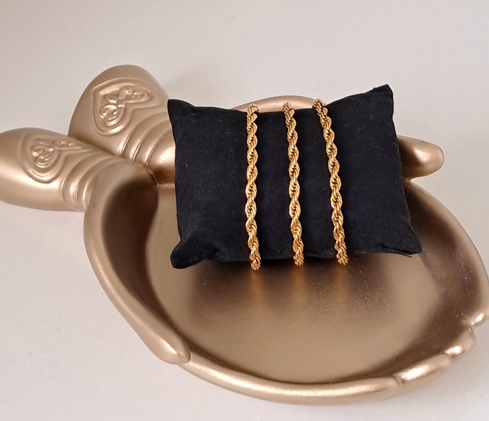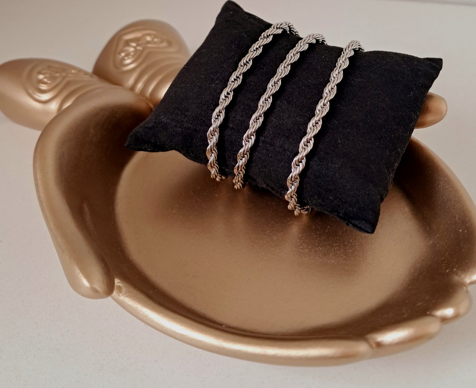 Confeccionada em aço inoxidável, esta pulseira apresenta um fio com espessura de 4mm e está disponível nas cores dourado e prateado. Com comprimento ajustável de aproximadamente 16cm, possui uma corrente de extensão de 4cm e fecho de mosquetão, garantindo estilo e segurança ao seu uso.