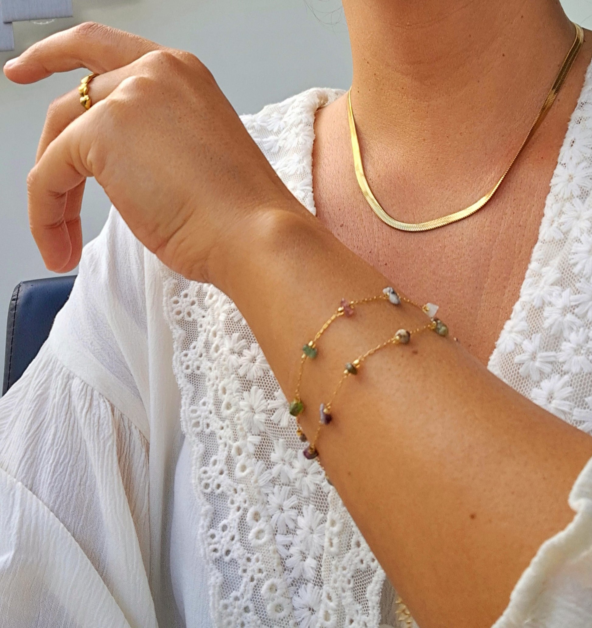 Combinando aço inoxidável e pedras naturais, essa pulseira dourada de 16cm + 4cm de extensão é fechada com um mosquetão, destacando-se pela sua beleza e durabilidade.