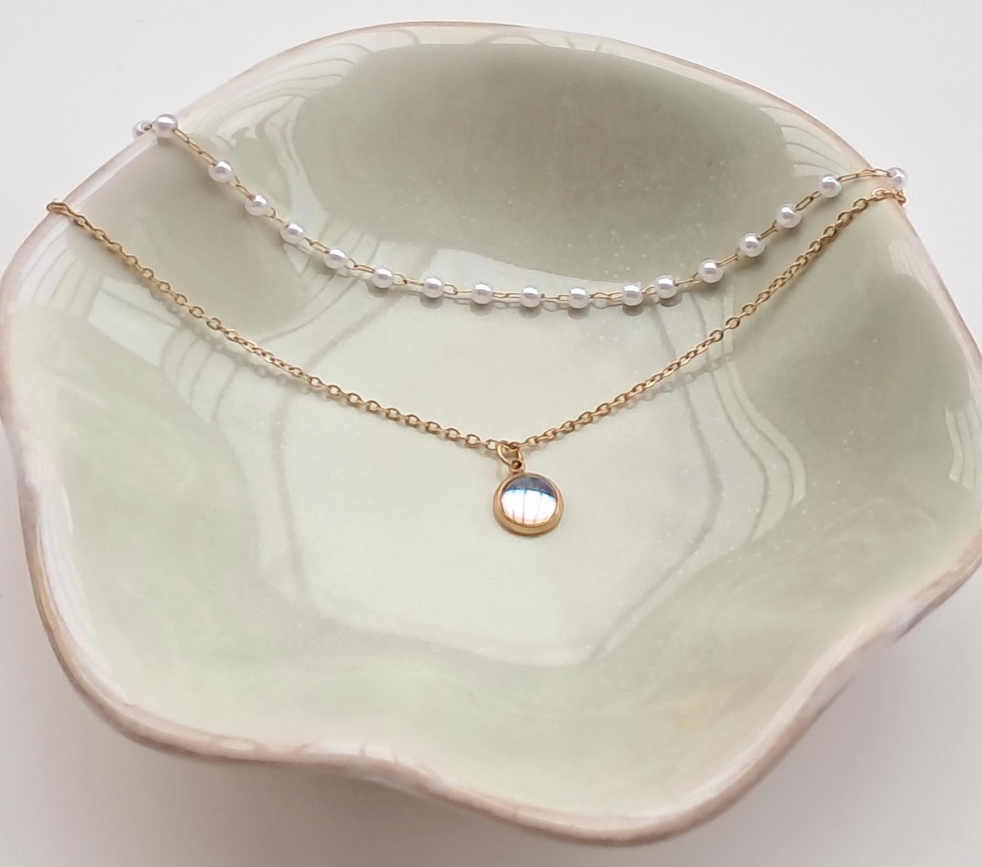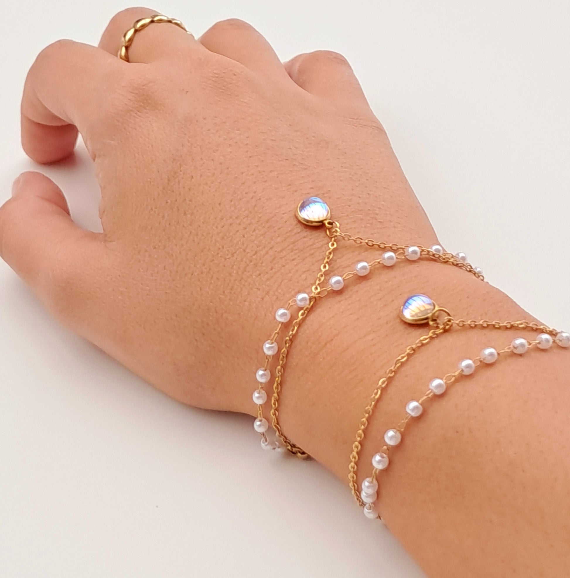 Apresenta um design sofisticado com aço inoxidável e pérolas sintéticas, comprimento de 16cm + 5cm de extensão e fecho mosquetão.